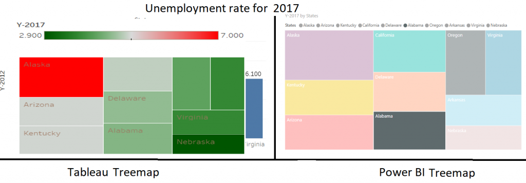 The Treemap in Tableau provides a colour range (usually between 2 major colours) to indicate the unemployment rate where else, in Power BI different colours were used to identify the blocks. Also, the actual numeric value is can be easily seen in Tableau with the colour range indicative of how close the values are to each other. Therefore, it is easier to relatively compare the values in Tableau generated Treemap than that of Power BI.