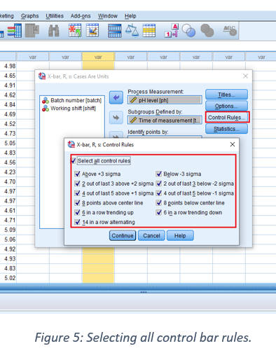 Select All Control Rules from the menu. Click Continue then Click OK in the X-Bar, R, s: Cases Are Units dialogue box.
