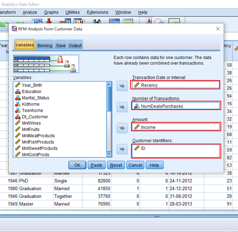 RFM analysis is a marketing analytic technique that can be used to infer basics information needed to evaluate performance of a product or the company as a whole on the basis of customers’ response to offers. Figure 1 shows the various marketing analysis that can be done on IBM SPSS.