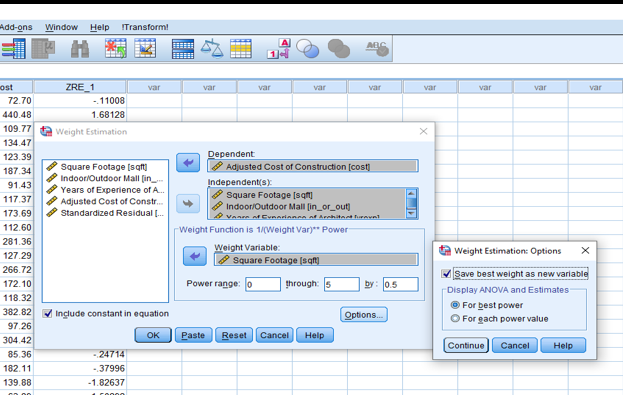 Select Weight for cost as the weight variable in WLS (weight least square). Select Save as shown in figure 10.