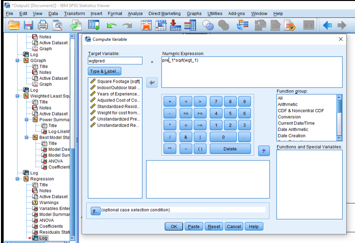 To compute weighted residuals, click the Dialog Recall tool and select Compute Variable: then type wgtresid as the target variable and Type res_1*sqrt(wgt_1) as the Numeric expression. And then Click OK.